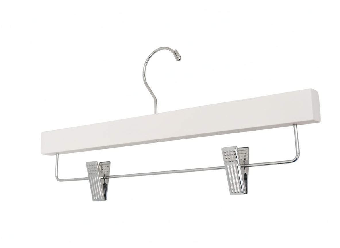 Add a touch of elegance and functionality to your clothing display with our 14" White Wooden Pant/Skirt Hanger. Designed for both style and durability, this hanger features a sleek white wood finish paired with chrome hardware for a clean, modern look that complements any retail or wardrobe setup.