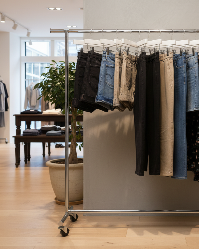 Equipped with cushioned clips, it securely holds pants, skirts, and delicate garments without leaving marks or creases. Perfect for boutiques, fashion showrooms, and organized closets that value both aesthetics and garment care.