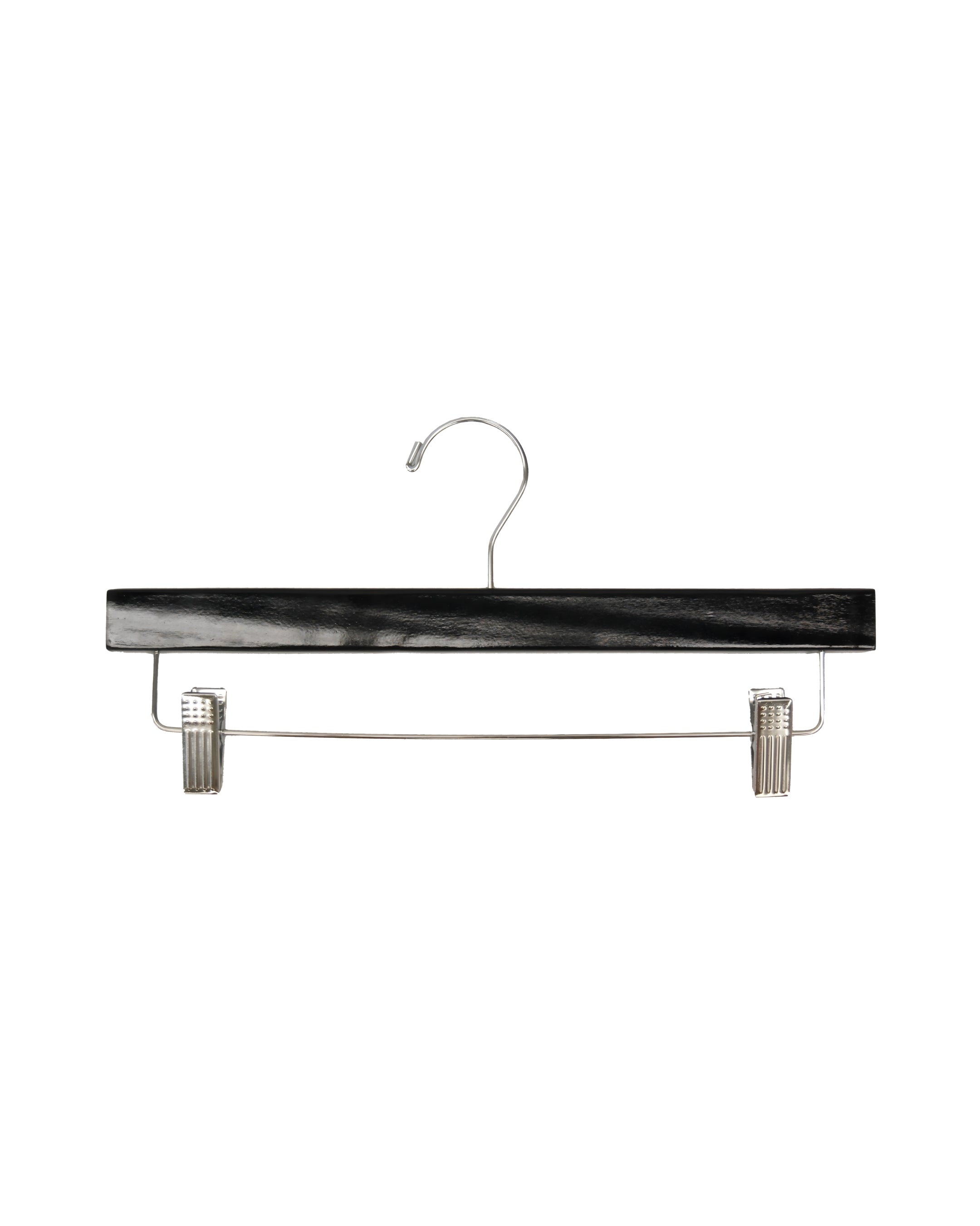 Crafted from durable black-finished wood and accented with sleek chrome hardware, this 14" hanger adds a professional and contemporary touch to any retail or personal wardrobe display. The cushioned clips gently hold pants, skirts, or shorts in place without creasing or damaging delicate fabrics.