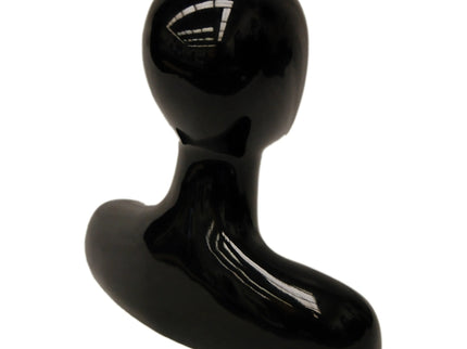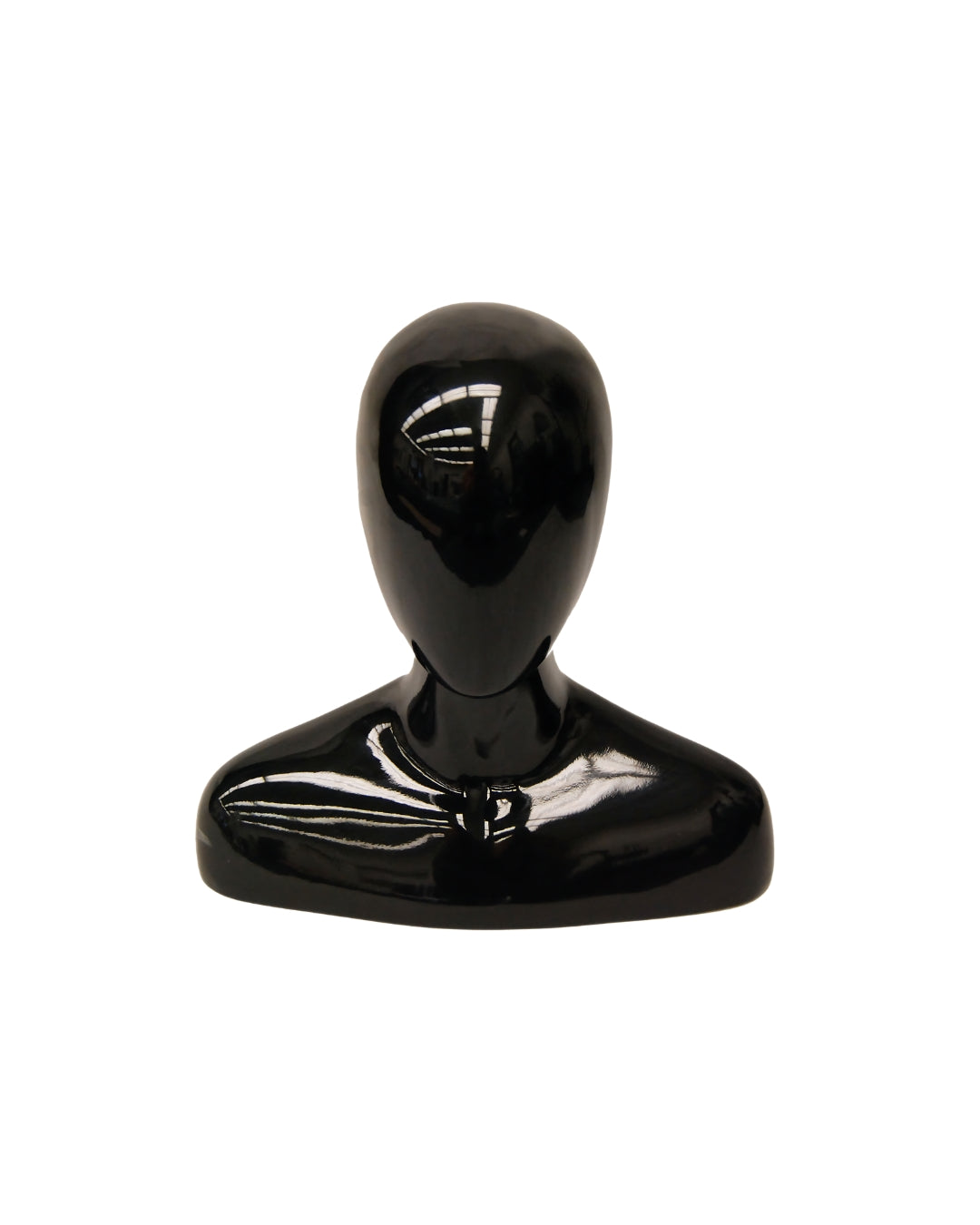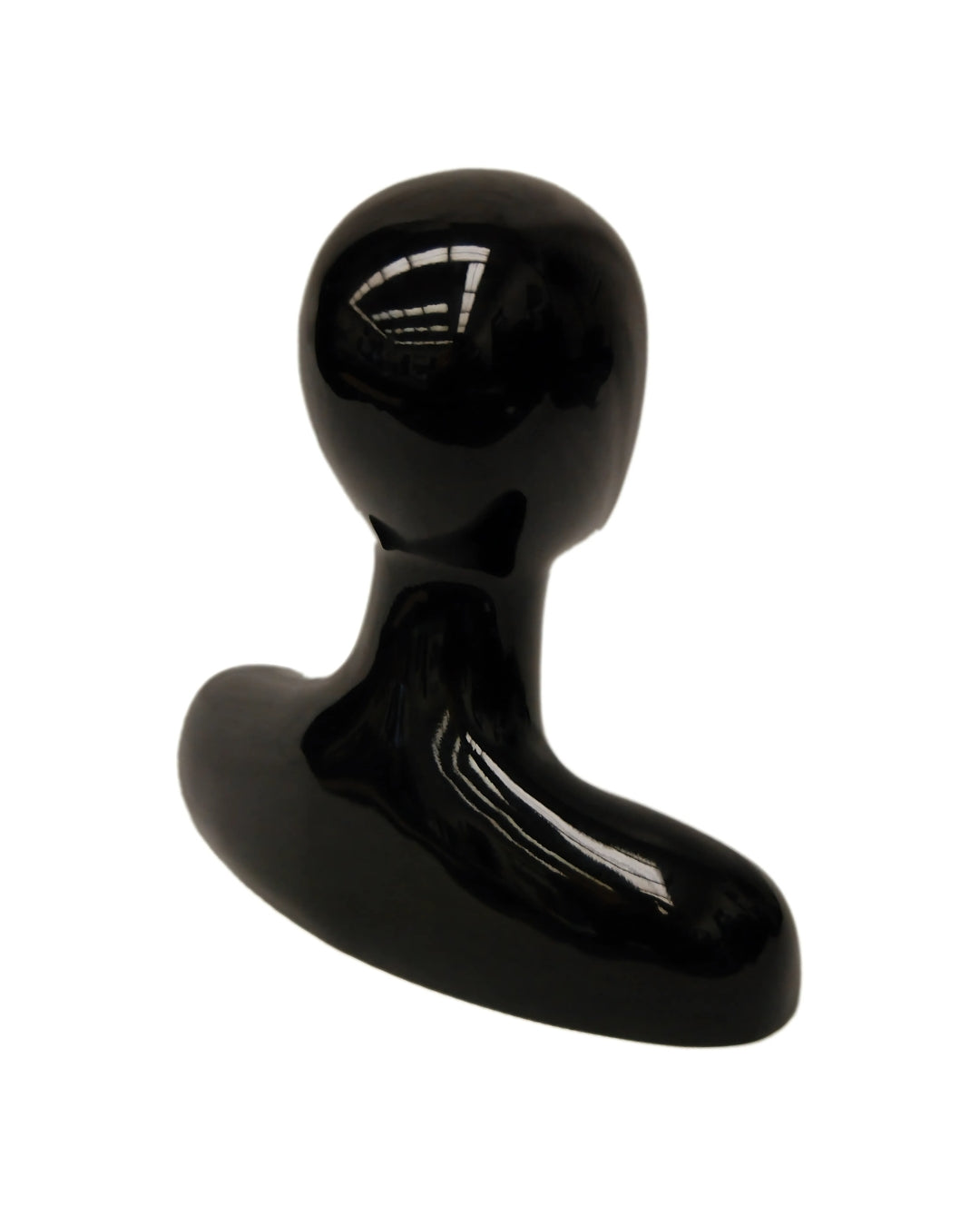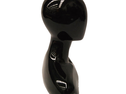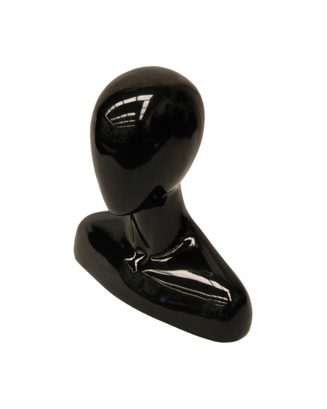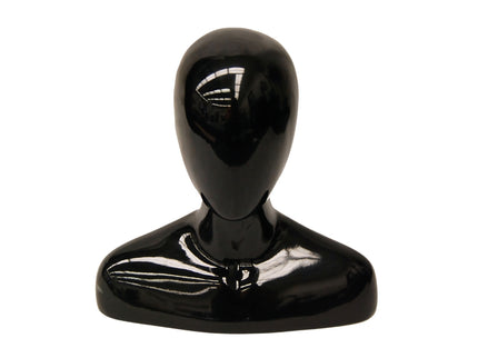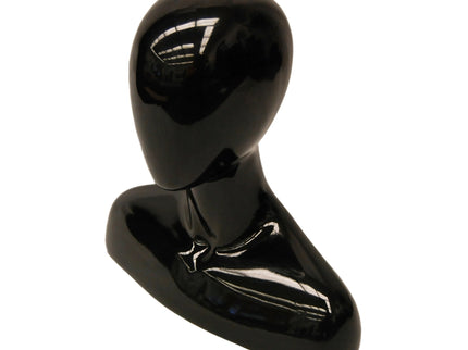Elevate your display with this abstract egg head female mannequin head featuring a sleek gloss black finish and rounded shoulders. Perfect for showcasing wigs, hats, jewelry, scarves, and other accessories, this mannequin head adds a modern and stylish touch to any retail or personal setup.